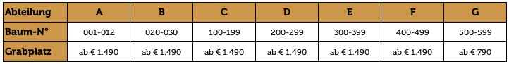 Alle Bäume, die mit ein von weitem sichtbarem blauen Band gekennzeichnet sind, sind Ruhestätte mit freien Grabstellen. Jeder Ruhebaum gehört einer bestimmten Kategorie an, die den Preis festlegt. Dabei spielen die Lage, die Größe und die Besonderheiten des Baumes eine entscheidende Rolle.
